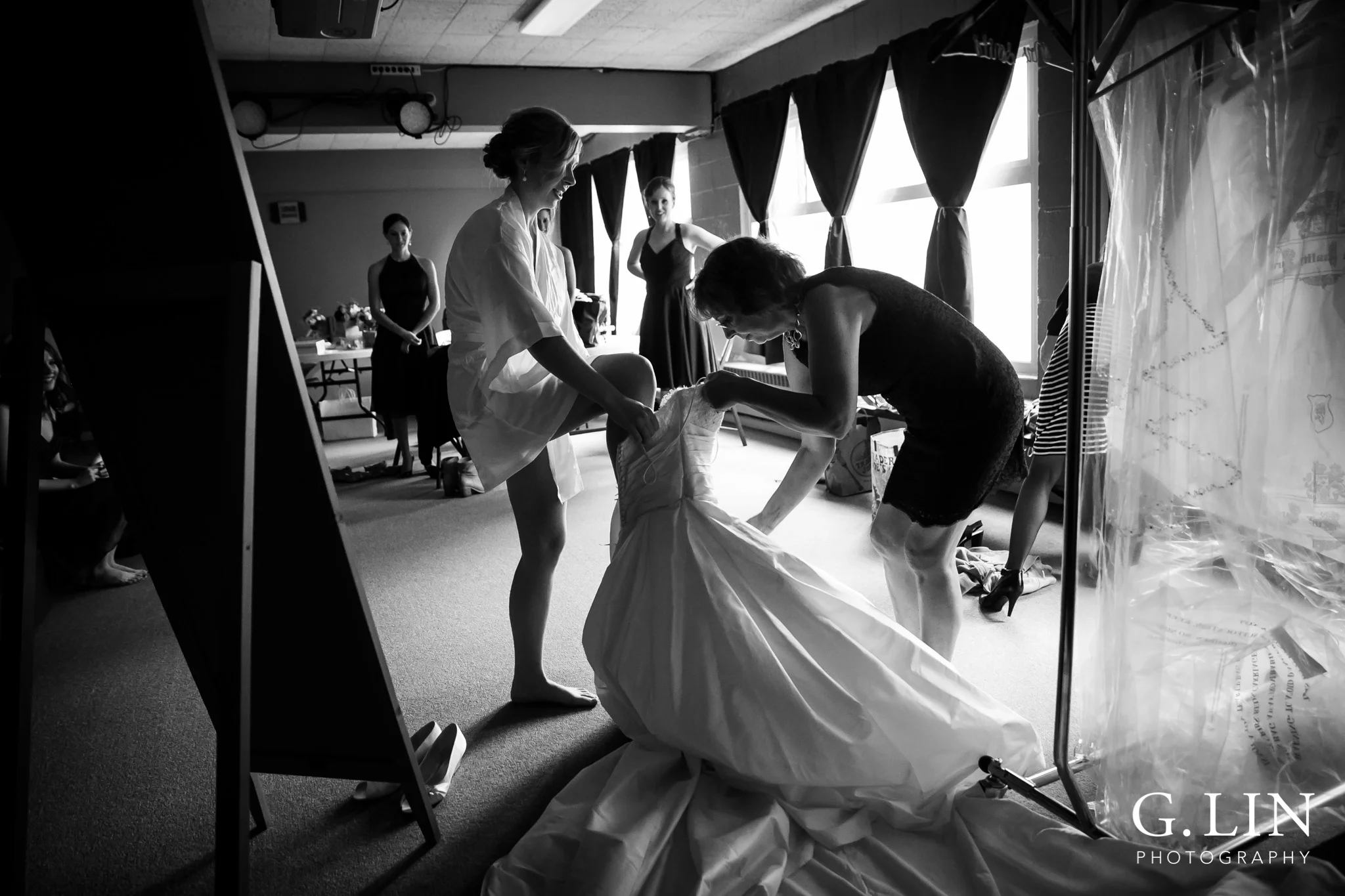 In the photo below, I wanted to emphasize the moment when the mother of the bride was helping her daughter get into her wedding dress. I found the colors of the wall and floor to be distracting (we were getting ready in a classroom at church). Changing the photo to black and white made the photo more refined and clearly puts the focus on the subject: the bride and mom.